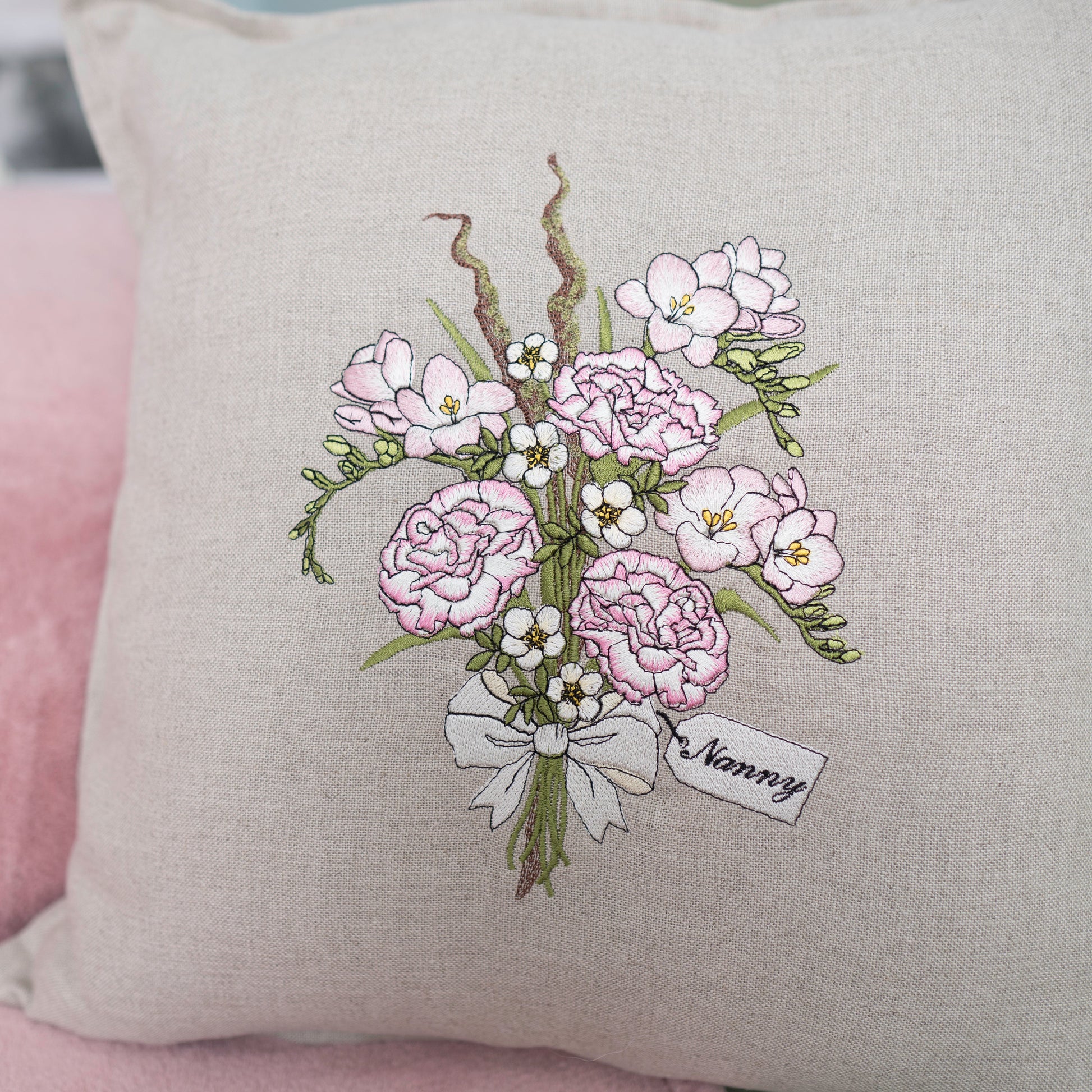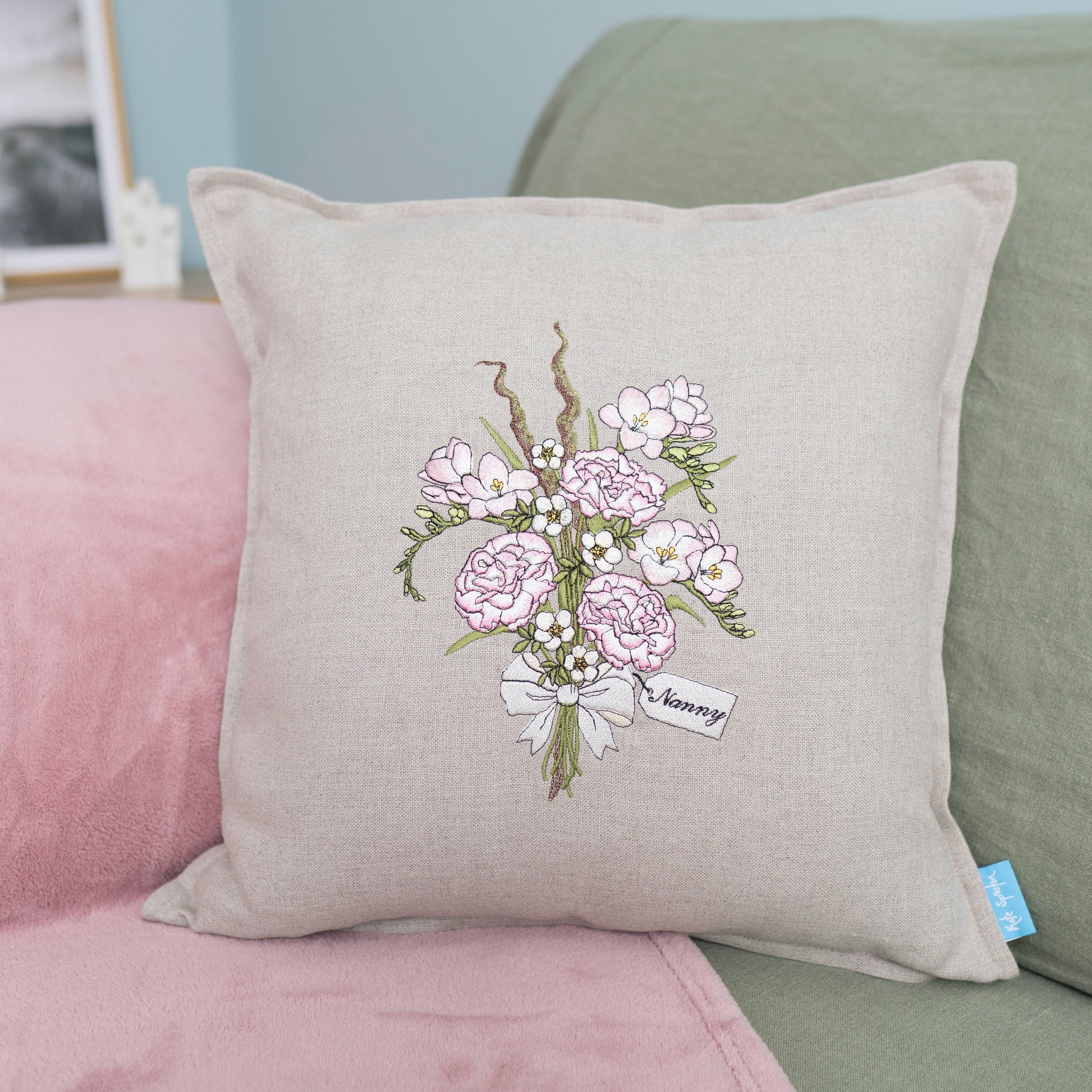 The Mother's bouquet cushion features carnations, freesias and potentilla flowers, and is perfect for mothers, grandmothers, or the mother figure in your life. Each embroidered bouquet is tied with a white bow, and can be personalised with a poignant name or date, making a beautiful keepsake to memorialize life's special moments.