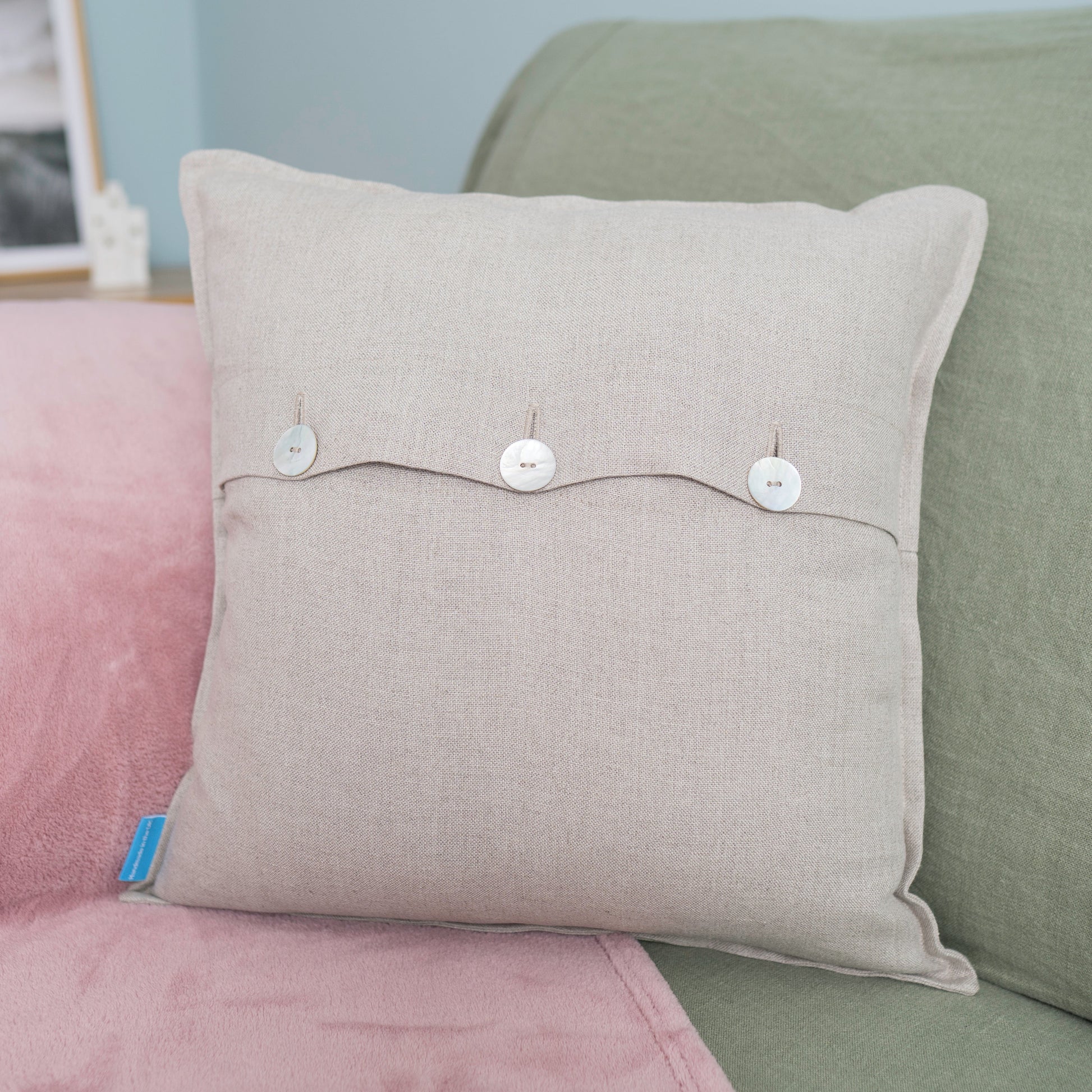 100% Natural Linen with polycotton polyester cushion pad and Mother of Pearl buttons.