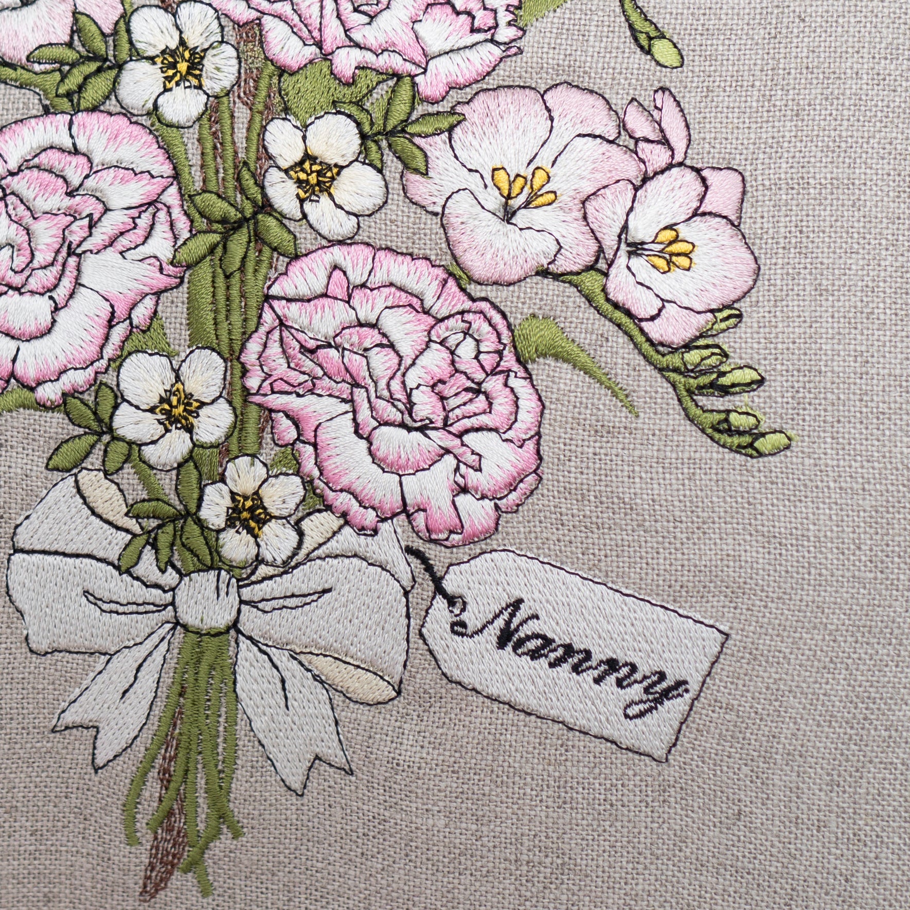 Please note, we can accommodate short names but please get in touch before ordering to double check if there is enough room for the name to be embroidered onto the tag. Cushions ordered without personalisation will be embroidered without the tag tied to the bouquet stems.